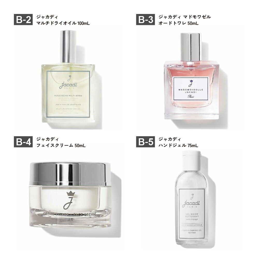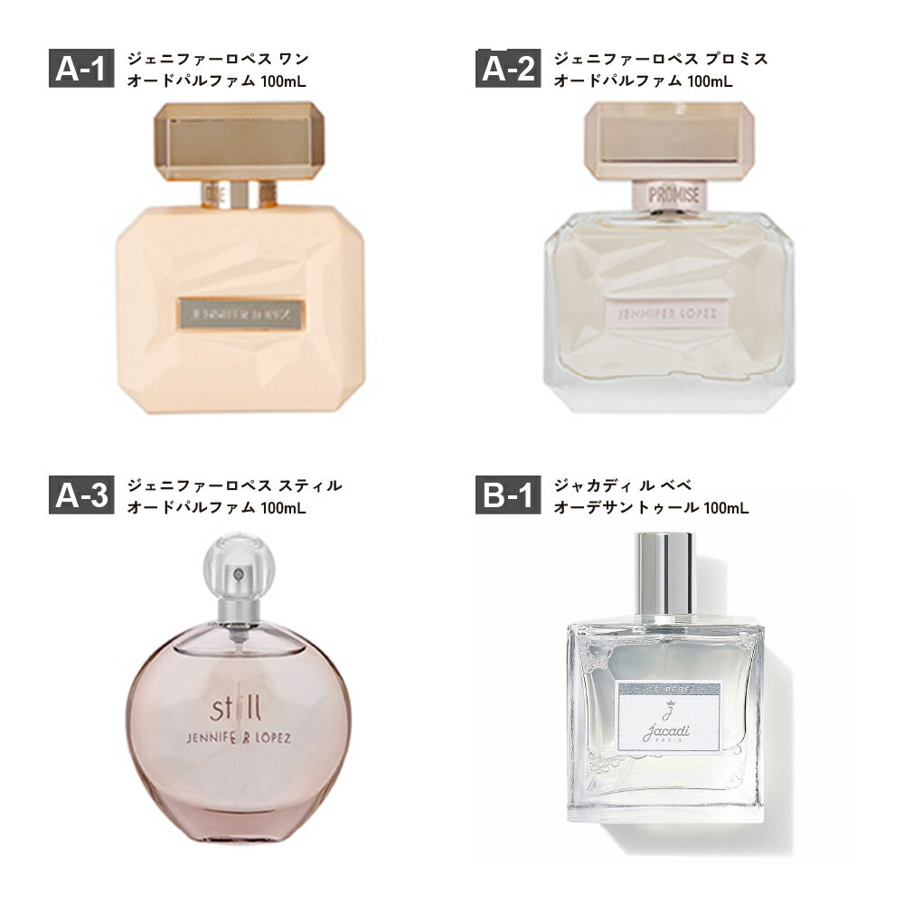 【A】ジェニファーロペス フレグランス 【A-1】ジェニファーロペス ワン オードパルファム 100mL 【A-2】ジェニファーロペス プロミス オードパルファム 100mL 【A-3】ジェニファーロペス スティル オードパルファム 100mL 【B】ジャカディ フレグランス&ケア 【B-1】ジャカディ ル ベベ オーデサントゥール 100mL 【B-2】ジャカディ マルチドライオイル 100mL 【B-3】ジャカディ マドモワゼル オードトワレ 50mL 【B-4】ジャカディ フェイスクリーム 50mL 【B-5】ジャカディ ハンドジェル 75mL 【B-6】ジャカディ ハンドクリーム 30mL 【B-7】ジャカディ トゥット プティット オーデサントゥール 50mL 【C】ジャガー&ゲス フレグランス 【C-1】ジャガー ジャガーライト オードトワレ 60mL 【C-2】ジャガー ジャガーペース アクセレレート オードトワレ 100mL 【C-3】ジャガー ジャガークラシック ブラック オードトワレ 100mL 【C-4】ジャガー ジャガークラシック オードトワレ 100mL 【C-5】ゲス ベッラ ヴィータ ローザ オードトワレ 100mL 【E】アクア シャボン フレグランス 【E-1】アクア シャボン みんなに愛されるシャボン 80mL 【E-2】アクア シャボン シトラススパの香り オードトワレ 80mL 【E-3】アクア シャボン コフレセット 23A トワレ&ハンドセット ウォータリーシャンプーの香り 【E-4】アクア シャボン きらめくモーニングフレッシュ オードトワレ 80mL 【E-5】アクア シャボン アロマティックタイムの香り オードトワレ 80mL 【F】ママ アクア シャボン 【F-1】ママ アクア シャボン ハンドクリーム薬用FAW19A 80g 各商品の成分一覧はこちら。